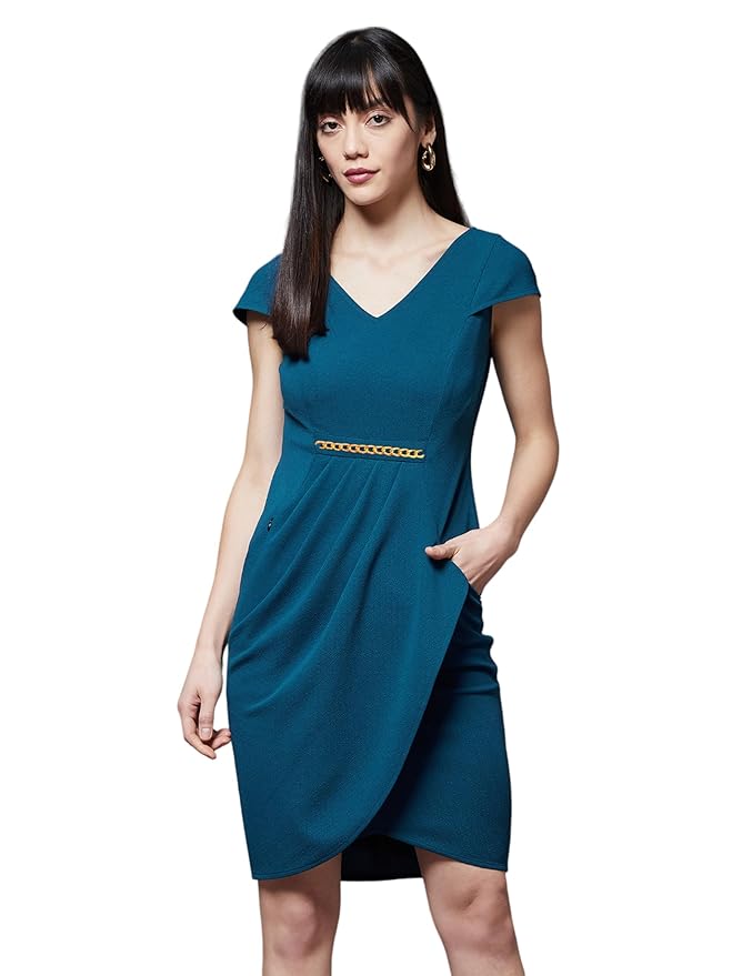- Pattern: Solid | Sleeve: Cap Sleeve | Fit: Slim Fit | Style: Wrapped | Length: Knee-Long | Neck: V-Neck